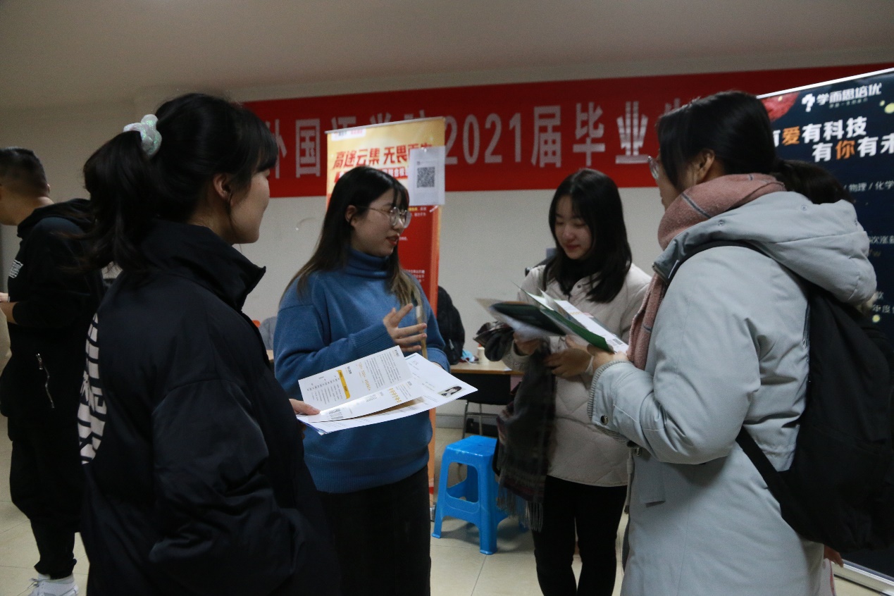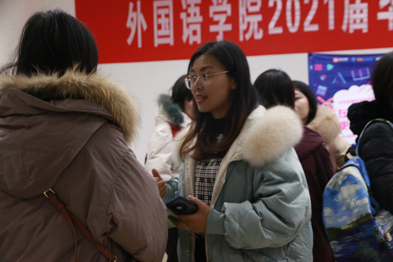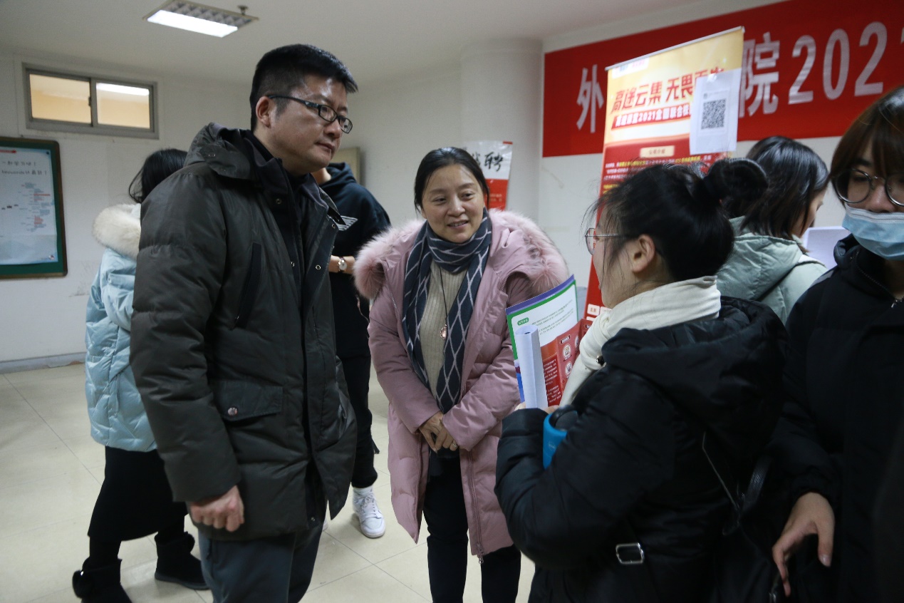为积极搭建毕业生与用人单位双向交流平台,拓宽学生就业渠道,积极做好策略官网2021届毕业生就业工作,1月8日晚,999策略手机论坛网址在圆楼505、521室举办2021届毕业生专场招聘会。来自策略官网英语、翻译和日语专业的200余名毕业班同学参加了招聘会。999策略手机论坛网址党委书记陈晓波、院长袁周敏、党委副书记徐欣娅、2017级辅导员高艳丽来到招聘会现场,与毕业生和招聘单位开展交流,了解企业人才需求状况和毕业生求职意向。
