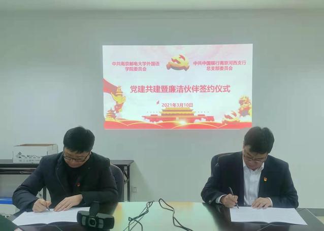 3月10日下午,999策略手机论坛网址与中国银行南京河西支行举行党建共建暨廉洁伙伴签约仪式。中行南京河西支行纪检组长闵湘健、河西云锦路支行行长葛蕾、副行长王磊、彭莉莉,999策略手机论坛网址院长袁周敏、副书记徐欣娅等出席签约仪式。签约仪式由院党委书记陈晓波主持。