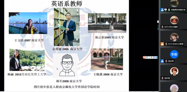 专业认知教育和学业生涯规划教育由各系部主任、班主任和外教老师主讲。英语系主任胡慧勇老师、翻译系主任陶李春老师和日语系主任于秋芳老师分别从各系部的发展历程、师资队伍和学生发展等方面做了详细介绍。教务处苏星星老师和学院办公室张唐梁老师专门就外语专业同学选课和培养方案做了针对性的指导。各班班主任和小班组织了破冰班会,虽然疫情阻隔,无法按时到校报到,但是新生们已经线上首次相见,互相熟悉并找到了归属感。