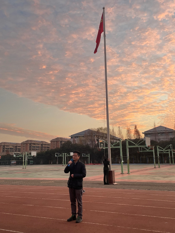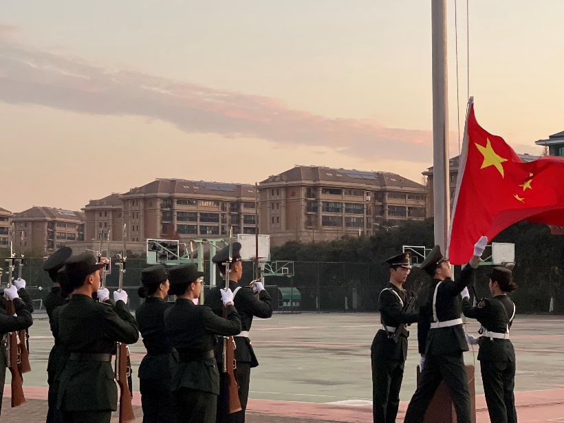 仪式伊始,全体师生列队肃立,国旗护卫队成员护送国旗入场,伴随着五星红旗冉冉升起,全体人员行注目礼,齐唱国歌。