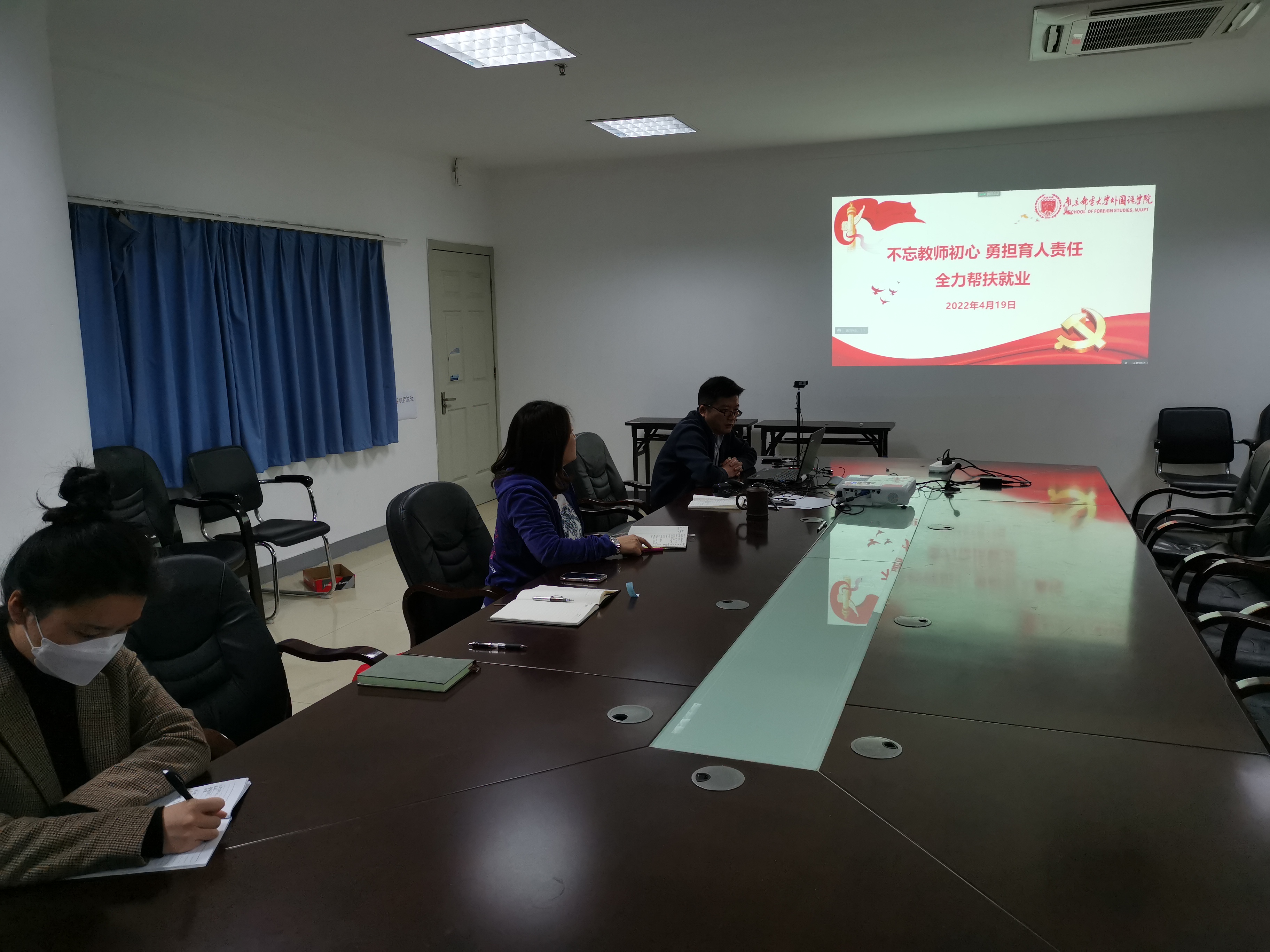 4月19日晚,999策略手机论坛网址召开2022届毕业生就业工作促进会。院党委书记陈晓波主持会议,院长袁周敏、副书记兼副院长徐欣娅、副院长吴建、副院长陈琳、各专业系部主任、教工党支部书记通过线上线下结合的方式参加会议。